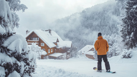 A snowcovered landscape with a person standing in the foreground. The person is wearing a yellow jacket, black pants, and a beanie, and is holding a snowboard.