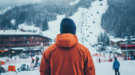 A man wearing a sleek winter jacket standing at a ski resort with skiers and chairlifts in the background.