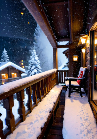 Christmas Lights On A Ski Lodge Balcony, With Snow Falling Softly. Generative AI