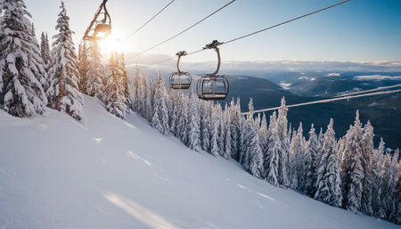 A ski chairlift with a wonderful view of the slopes on a bright winter day.