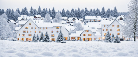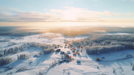 aerial view of a winter landscape featuring houses and trees in a 20th century scandinavian style. this stock photo captures the essence of rural life scenes with its golden light and lens flare, creating a cabincore aesthetic. the high-quality uhd image showcases the beauty of the winter scenery. ai generated