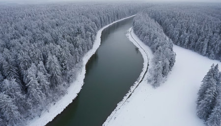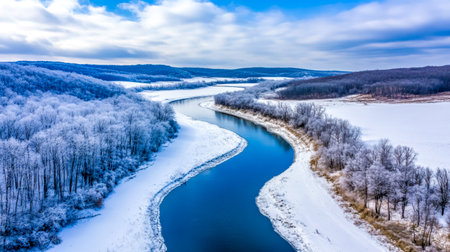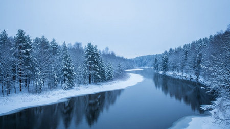 A serene winter landscape featuring a snow-covered river winding through frosty trees. Peaceful atmosphere.