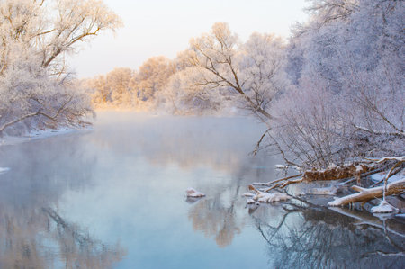 wonderful winter scene. Frosty, misty morning on the small river. frost covered trees in the warm glow of sunrise on the beach. The beauty of the world. Europe. Ukraine. Ternopil