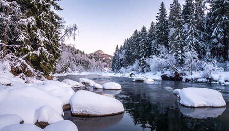Scenic winter landscape featuring river stones surrounded by snow-covered forest and tranquil waters reflecting cloudy sky in a serene atmosphere