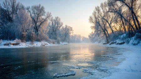 A tranquil winter scene showcasing a frozen river bordered by frost-covered trees, with gentle morning light illuminating the serene landscape and icy waters.