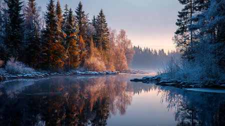 Scenic landscape of snowy riverbanks and pine forest at sunrise, creating a tranquil winter scene