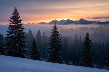 Sunrise among misty mountains and forests, quiet morning in snowy mountains and forests