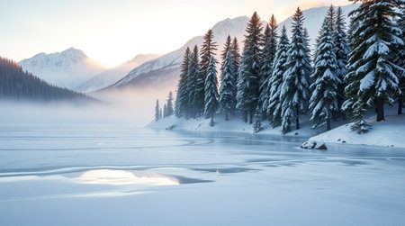 Serene winter landscape with snow-covered mountains and frozen lake.