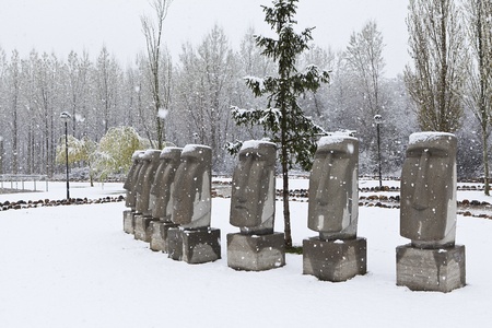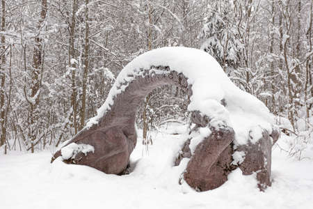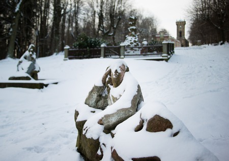 Finland, Lahti, 14 February 2021 Statues, human figures, made of stone and winter landscape of Lanupuisto park on a frosty day. Contemporary art. High quality photo