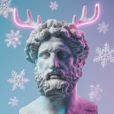 Greek bust adorned with reindeer antlers creates a playful holiday scene in a winter wonderland
