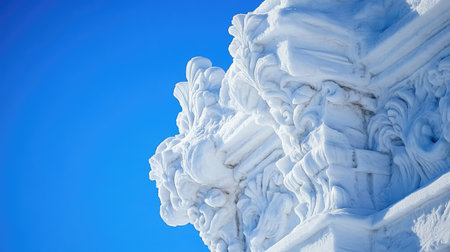 Close-up of intricate frosted ornamentation against a bright blue sky. The delicate snow covers architectural details, showcasing winter beauty and artistry.