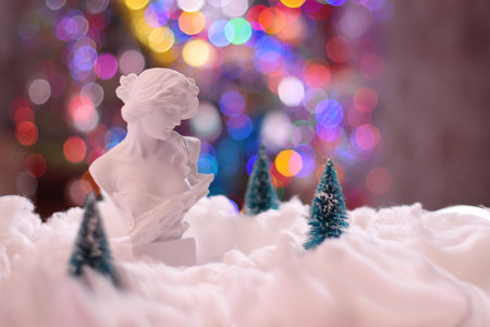 Female bust Greek sculpture in snow and Christmas trees, holiday card concept
