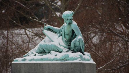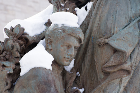 Bronze monument of a woman in winter snow park. Closeup with blurred background.