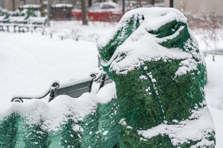 Plants, bushes and trees in a park or garden covered with green blanket antifreeze, swath of burlap, frost protection bags or roll to protect them from frost, freeze and cold temperature