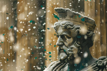 A majestic stone statue, covered in snow, amidst a confetti shower.