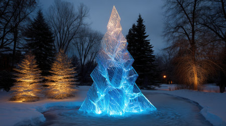 A striking ice Christmas tree illuminated with blue lights stands majestically in a snowy landscape. Surrounding evergreens add to the festive ambiance at dusk.