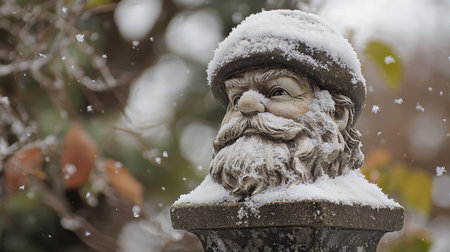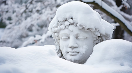 A beautifully detailed statue covered in snow adds charm to a winter garden scene. The serene expression and snowy backdrop create a peaceful atmosphere.