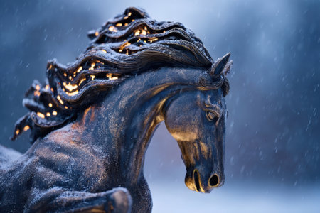 A stunning bronze statue of a horse stands proudly as snowflakes gently fall around it. The setting is serene and cold, capturing the essence of winter's beauty and tranquility.
