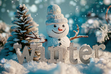 Word Winter on the snow next to a toy snowman and fir tree. Christmas and New Year seasonal theme.