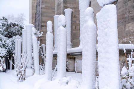 Old historical ottoman Muslim cemetery under snow. Islamic tombstones in the Suleymaniye Mosque Cemetery. Winter in Istanbul, Turkey.