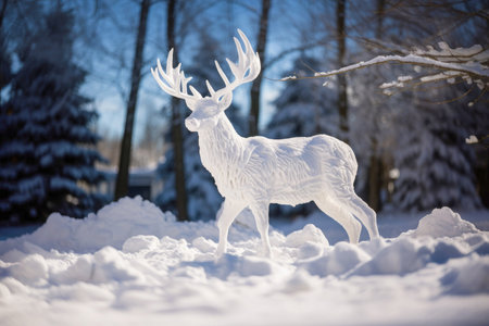 An AI-generated illustration of a white deer made out of snow in a peaceful winter landscape