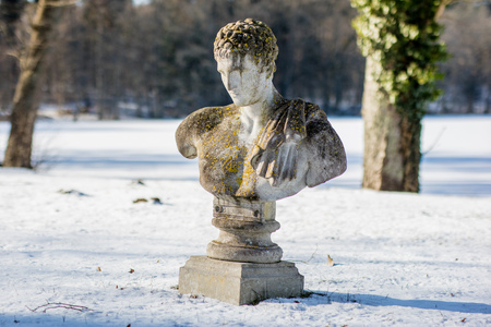 The sculpture is set in a park next to the historic Teutonic castle. Bust at the park path. Season winter.