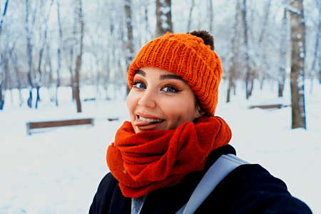 Young beautiful smiling woman in winter park or forest wearing orange scarf and making selfie.