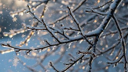 Delicate tree branches covered in sparkling ice crystals during a gentle winter snowfall