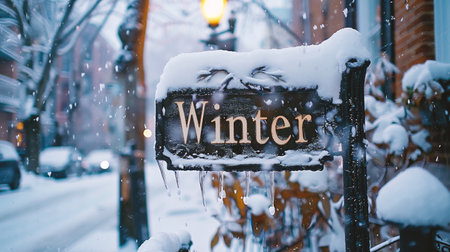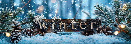 Word Winter on the snow surrounded by fir tree twigs, cones and lights on bokeh background. Christmas and New Year theme.
