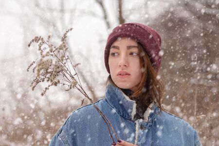 Beautiful young woman in winter jacket, knitted beanie hat and scarf, outdoors in the forest on snowing winter day.