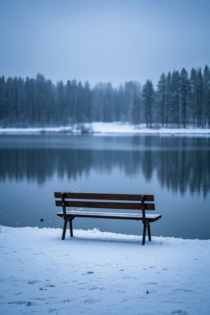 Snowy Lakeside Bench Nature