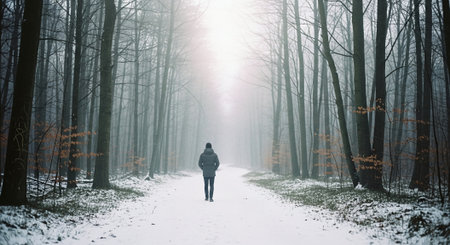 A solitary figure walking down a snowy path in a foggy forest, surrounded by tall trees with bare branches