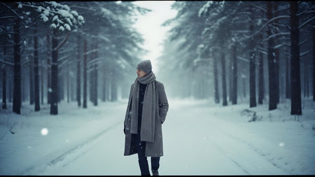 A person standing in a snowy landscape, wearing a warm coat, with a serene winter scene in the background, foggy atmosphere, trees in the distance