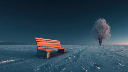 A lone tiny bench made of wood rests in untouched snowfields of Hokkaido, clear blue winter sky above, minimalistic negative space, medium format photography, cool subdued tones, quiet mood of solitude and contemplation