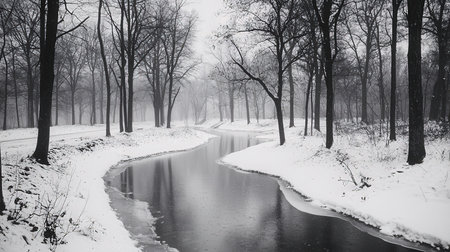 A snowy landscape with a river and trees. The water is calm and the snow is covering the ground. The scene is peaceful and serene