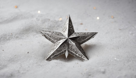 A beautifully crafted silver star stands out against a bed of fresh, untouched snow, capturing the magic of winter in a tranquil outdoor setting.
