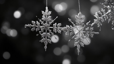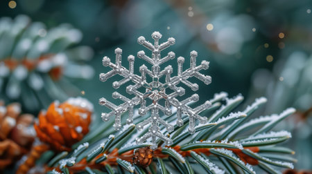 A stunning snowflake decoration shines brightly against a frosted tree branch, surrounded by soft bokeh lights, creating a magical winter atmosphere perfect for festive settings.