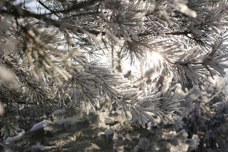 Conifer branches close up with needles covered with white frost on blurred background. Winter scenery with sunlight. Selective focus