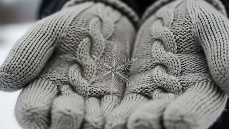 Female hands in gray knitted mittens holding a white snowflake. Winter concept.
