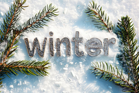 Word Winter on white snow surrounded by fir tree twigs. Christmas and New Year seasonal theme.