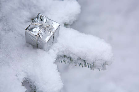 A beautifully wrapped silver gift box featuring a snowflake decoration, placed on a shimmering surface, evoking a joyful holiday spirit and festive celebration