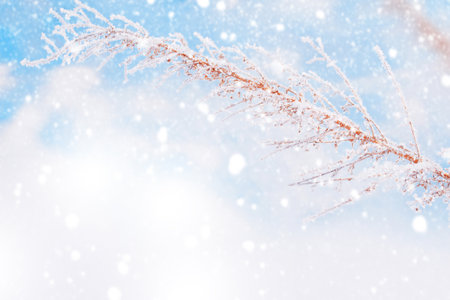 Close-up view of frost-covered plants in a winter field. Serenity and peace.