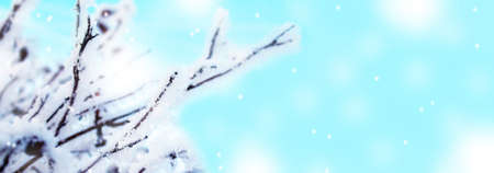 Close-up tree branches covered in snow with severe frost. Blue winter sky. Winter seasonal landscape. Selective focus. Banner format. Copy space. Snowfall.