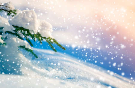 Winter snowy landscape. Lovely winter day. Christmas New Year holiday background with snowy plants, soft flares of sunlight, snowflakes