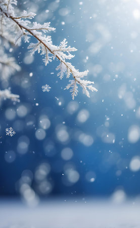 A close-up of snow-covered branches with snowflakes falling in the background, showing the beauty of a winter wonderland.