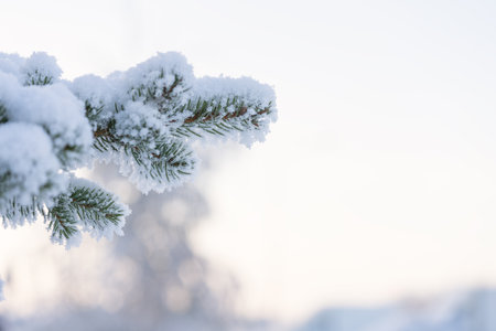 Closeup photo of spruce tree branch covered with hoarfrost after very cold night