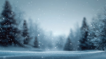 A serene winter scene features a blanket of pristine snow, with evergreen pines softly obscured by drifting snowflakes, evoking calmness on a frosty, tranquil day.
