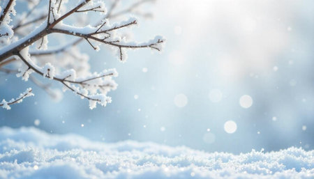 Winter snow background. Cozy winter nature scene with snow and sun flare. Abstract blurred background. Copy space, Selective focus, toned