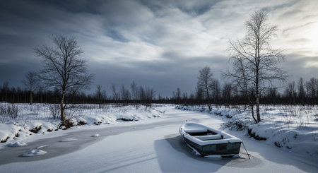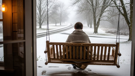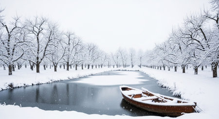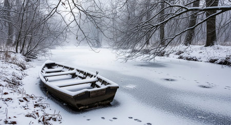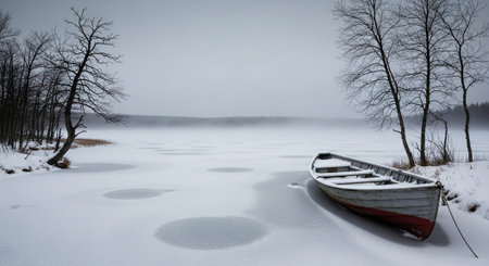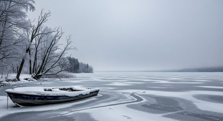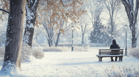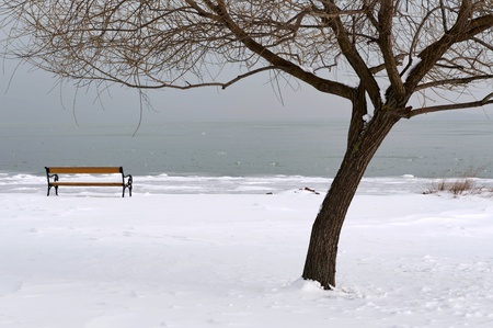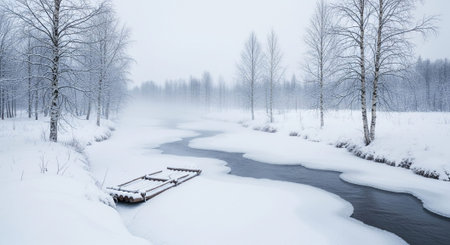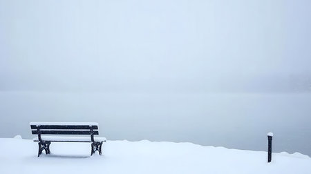 A snow covered bench sits alone by a misty lake in winter. Serenity and tranquility are the main themes.