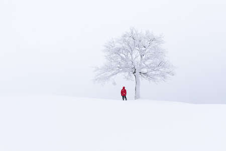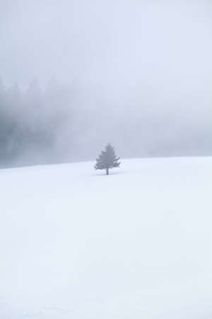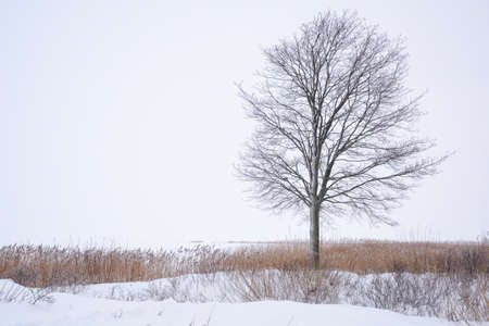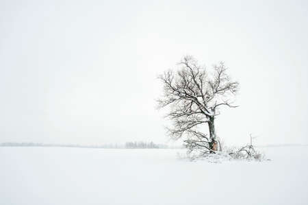 Amazing landscape with a lonely snowy tree in a winter field. Minimalistic scene in cloudy and foggy weather
